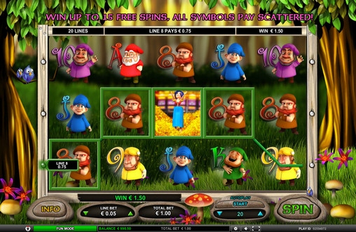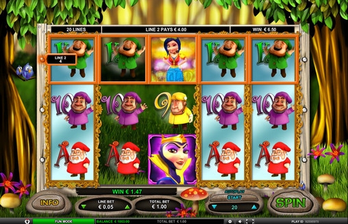 На экране игрового автомата 7 Lucky Dwarfs можно увидеть Белоснежку, королеву и семерых гномов, изображенных рядом с обозначениями номиналов игральных карт от восьмерки до туза.