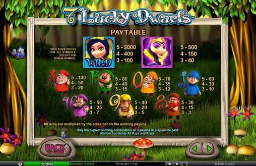 7 Lucky Dwarfs – пятибарабанный видео-слот с двадцатью линиями (они все постоянно активны) и расположением символов на экране в три ряда. Играть на игровом автомате можно по ставке на линию от одного цента до десяти евро, а на спин принимается до двухсот евро.