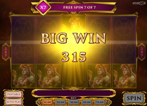 - Free Spins – Во время бесплатных вращений ставку за игрока делает заведение. На экране в каждом спине появляются только изображения одной из героинь. При этом третья колонка постоянно занята данным персонажем. На барабанах, помимо выигрышных картинок, есть пробелы, которые не участвуют в формировании комбинаций. С каждым спином на единичку увеличивается множитель, достигающий х7 в последнем раунде.
