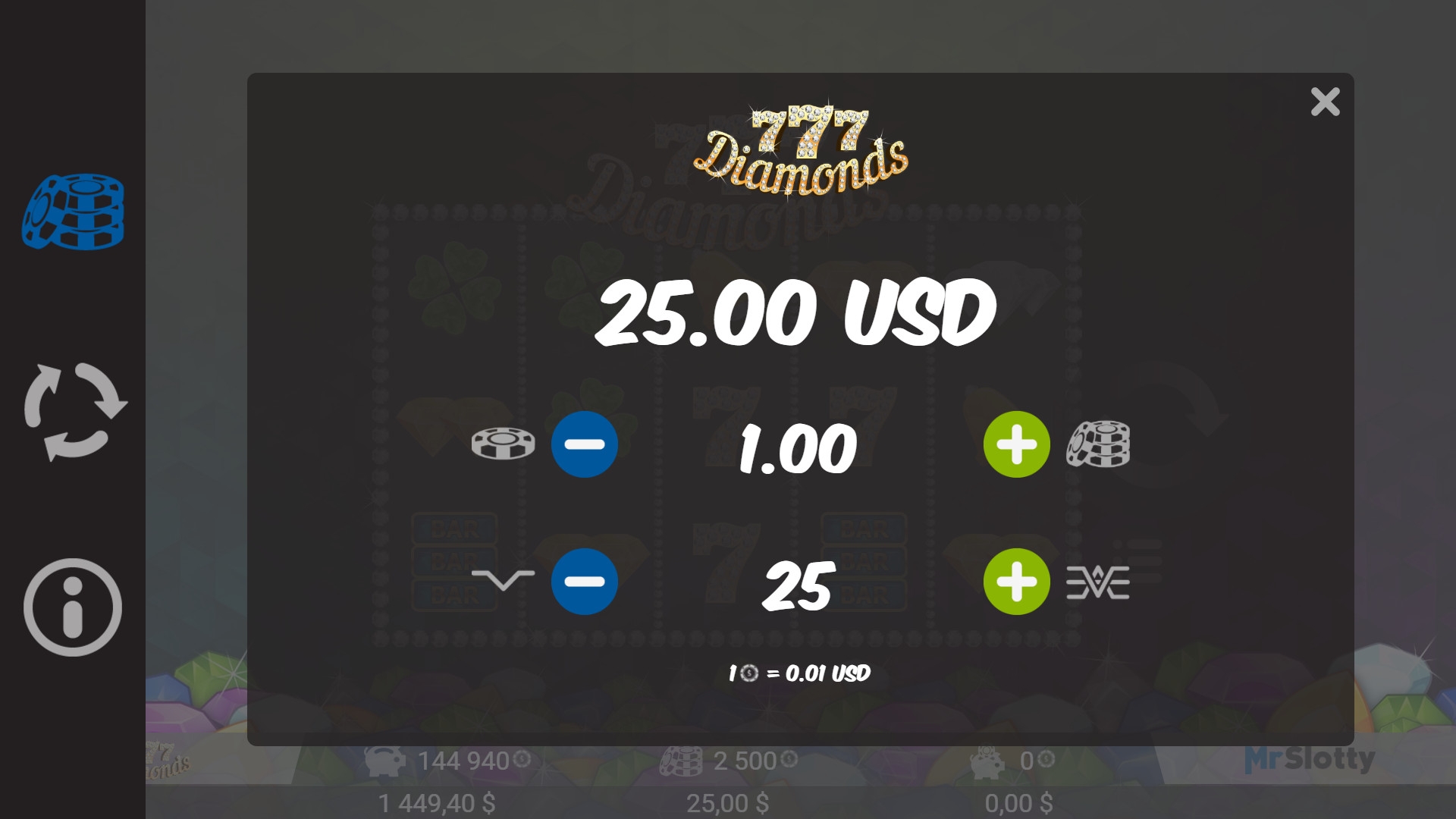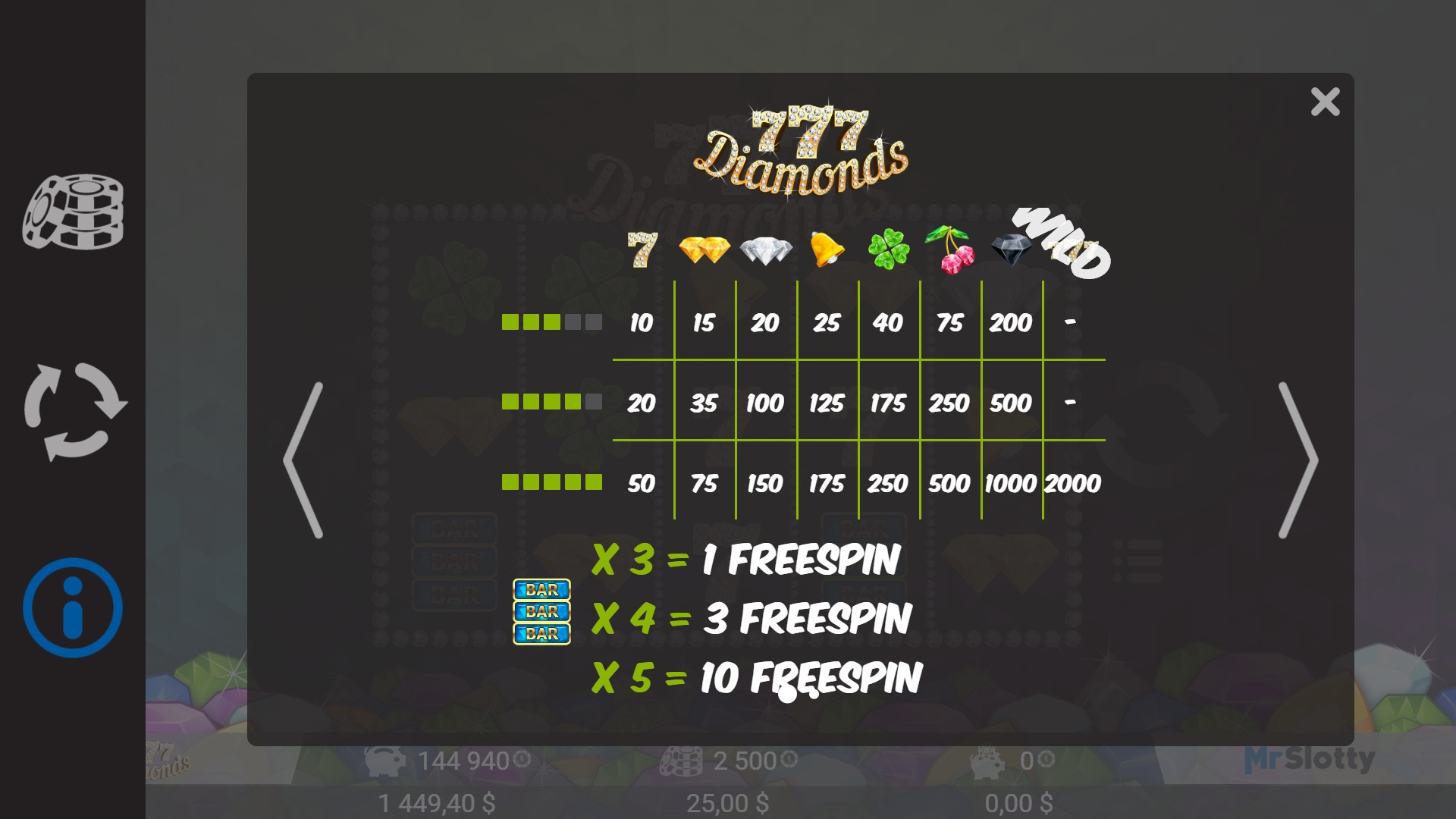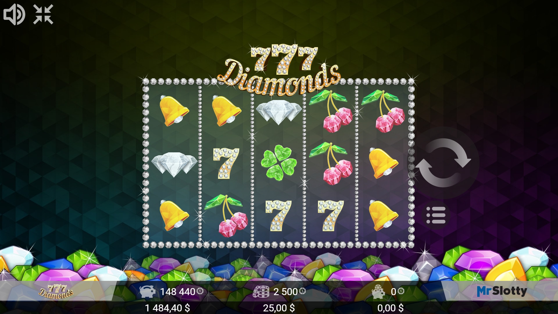 В игровом аппарате 777 Diamonds нет прогрессивного джекпота Mr. Slotty.