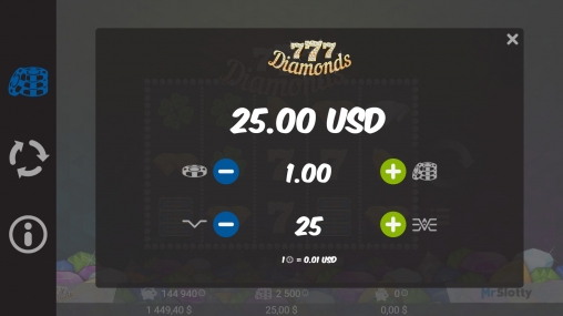 игровом автомате «777 бриллиантов» пять вращающихся барабанов, двадцать пять активных линий и пятнадцать ячеек для символов на экране.