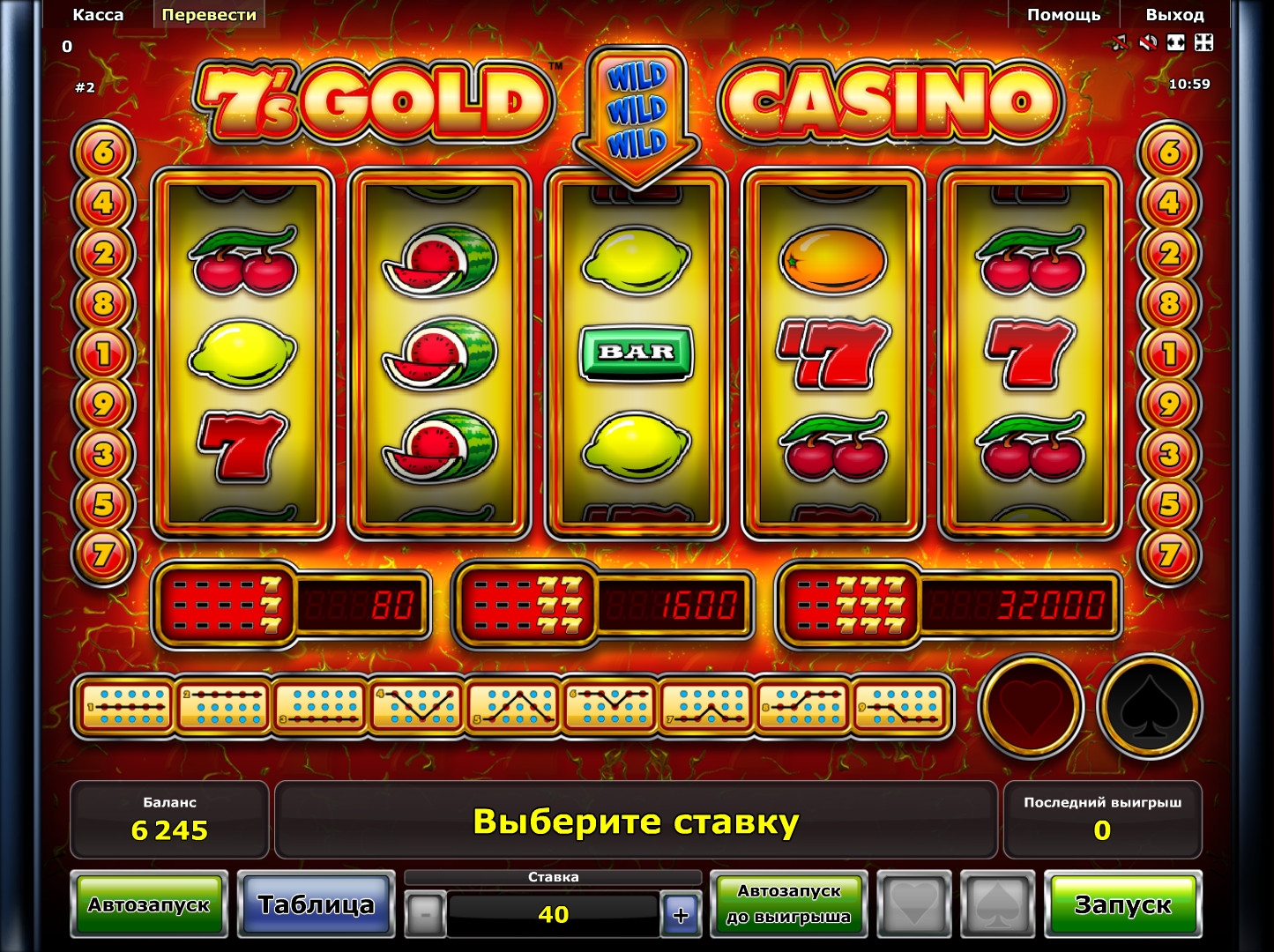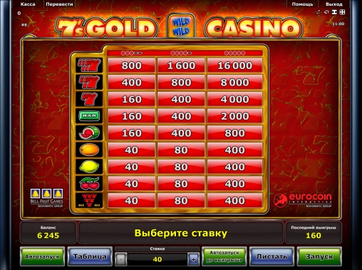 В 7’s Gold Casino пять барабанов и пятнадцать картинок на основном экране. Играть можно только по девяти линиям. Ставка принимается на спин. Она варьируется в диапазоне от сорока единиц до десяти тысяч кредитов.