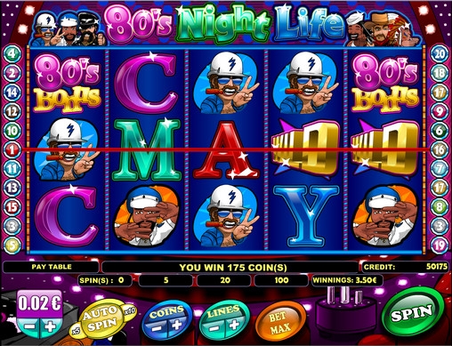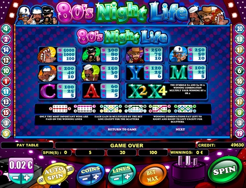 В игровом автомате 80’s Night Life пять барабанов и двадцать линий. Пользователь сам решает, какое количество линий должно участвовать в игре. В видео-слоте действуют особые символы, дополнительные множители выплат, бонусные раунды и другие функции.