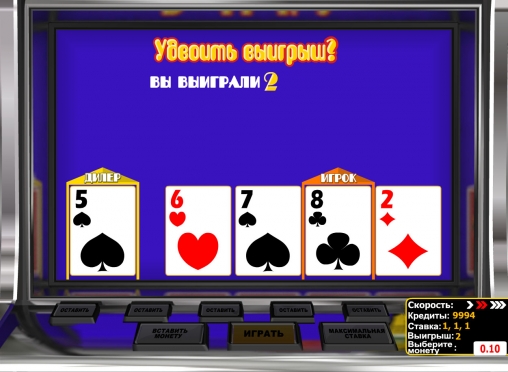 Общий выигрыш за раунд можно попытаться увеличить в раунде на удвоение. Вы увидите одну открытую карту и четыре закрытых. Вам предстоит открыть один из четырех листов, выбрав любой из них. Если карта окажется старшей той, что лежит рубашкой вниз, выигрыш возрастет в два раза. В противном случае вы проиграете деньги. В одном раунде допускается несколько розыгрышей, но без права на ошибку.