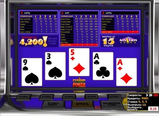 Онлайн видео-покер «Тузы и картинки – пирамида» полностью русифицирован, что существенно облегчает знакомство с игрой.