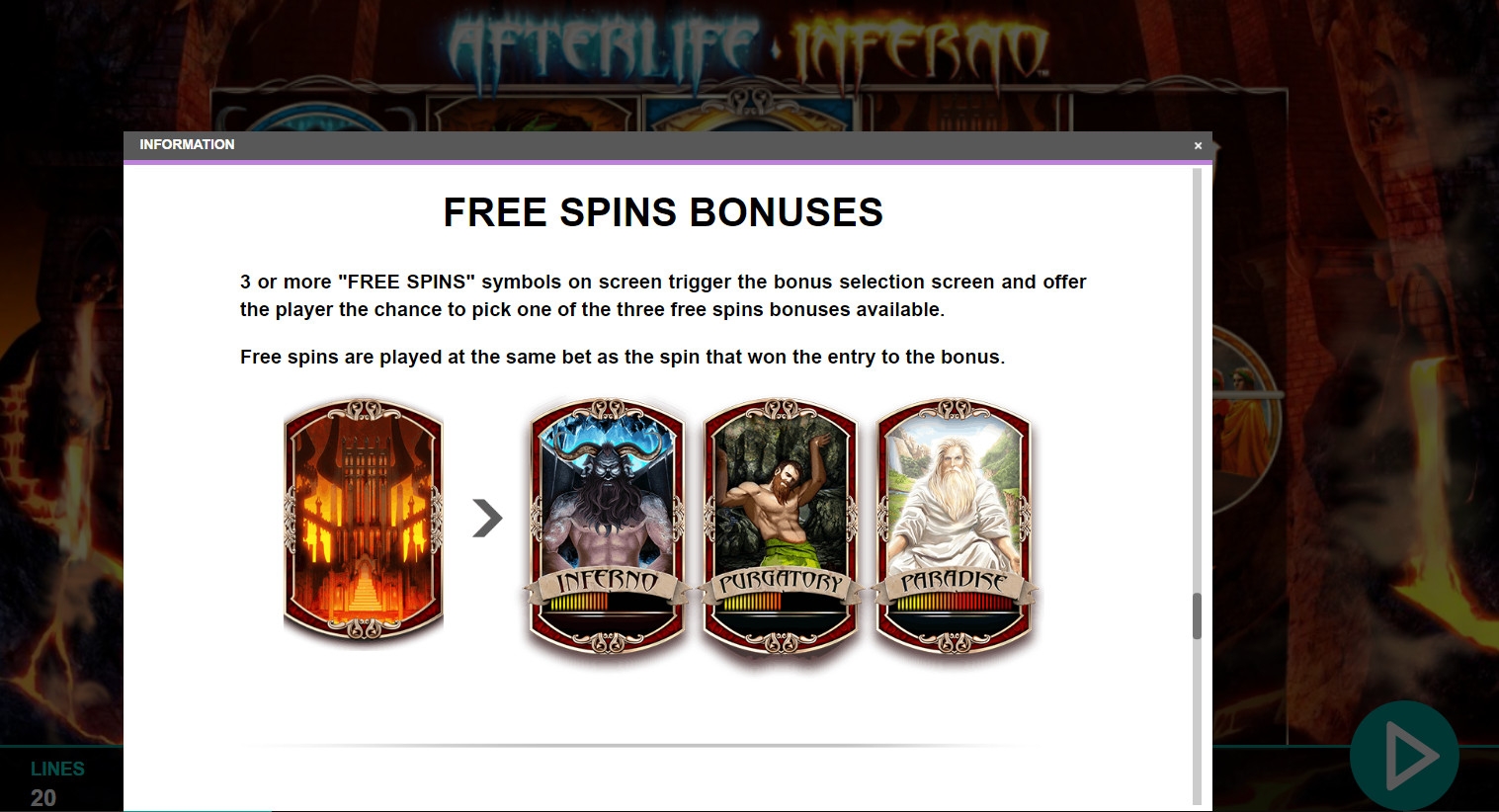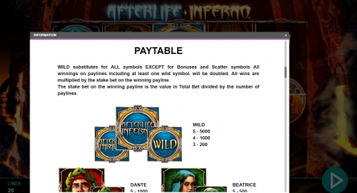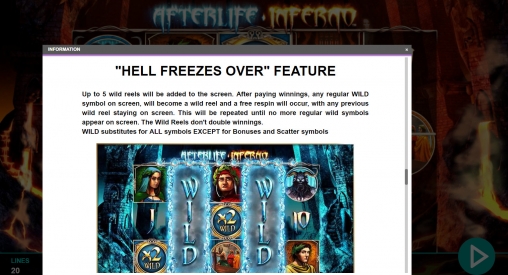 Видео-слот Afterlife Inferno имеет пять барабанов. Активных линий двадцать. Они постоянно задействованы. Картинки выстраиваются на экране в три ряда.
