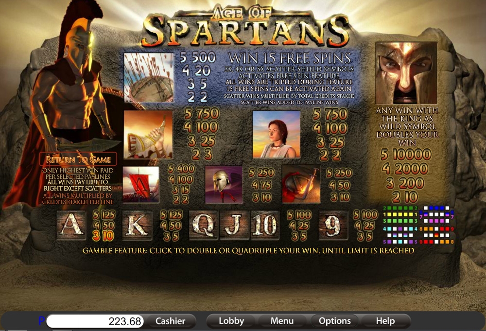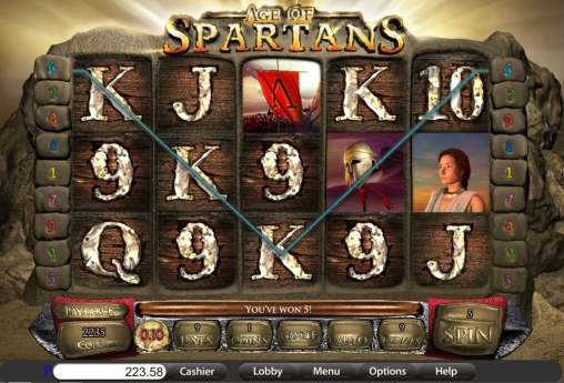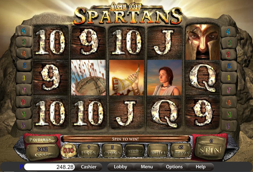 Age of Spartans – 5-барабанная модель с девятью линиями и тремя рядами картинок на экране. Схема расположения активных линий доступна в правилах.