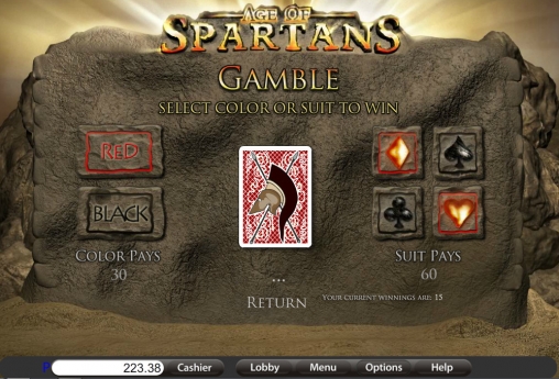 По завершению спина пользователь может сразу перевести деньги на счет или же попытаться их увеличить в риск-игре. Здесь можно угадывать цвет или масть закрытой карты. Правильный цвет удваивает выплату, а верно названная масть увеличивает ее в четыре раза. Правила разрешают в одном раунде играть несколько раз подряд. Ошибаться нельзя.