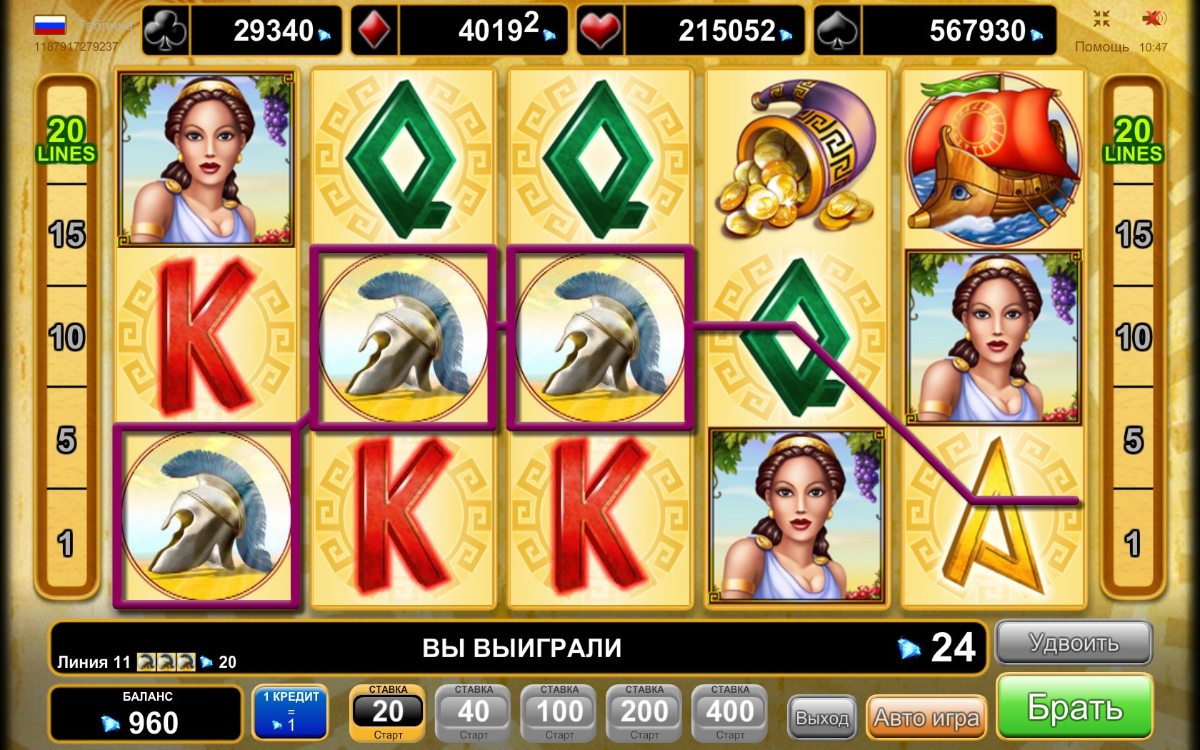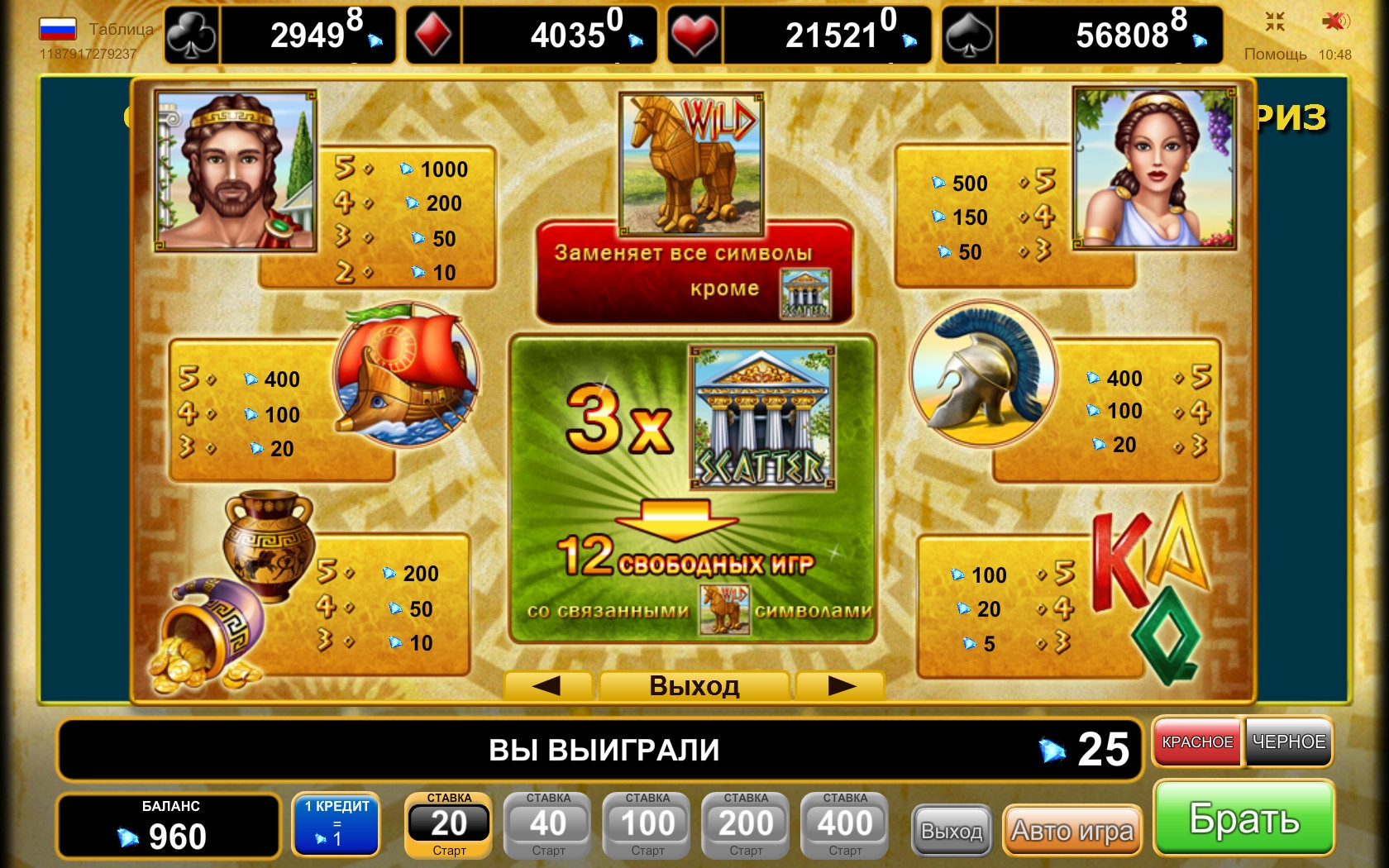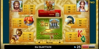 Герои древних преданий о Троянской войне, шлем воина, греческий корабль, амфоры с золотыми монетами и буквы, означающие номиналы игральных карт, - такие обычные картинки используются на барабанах игры.