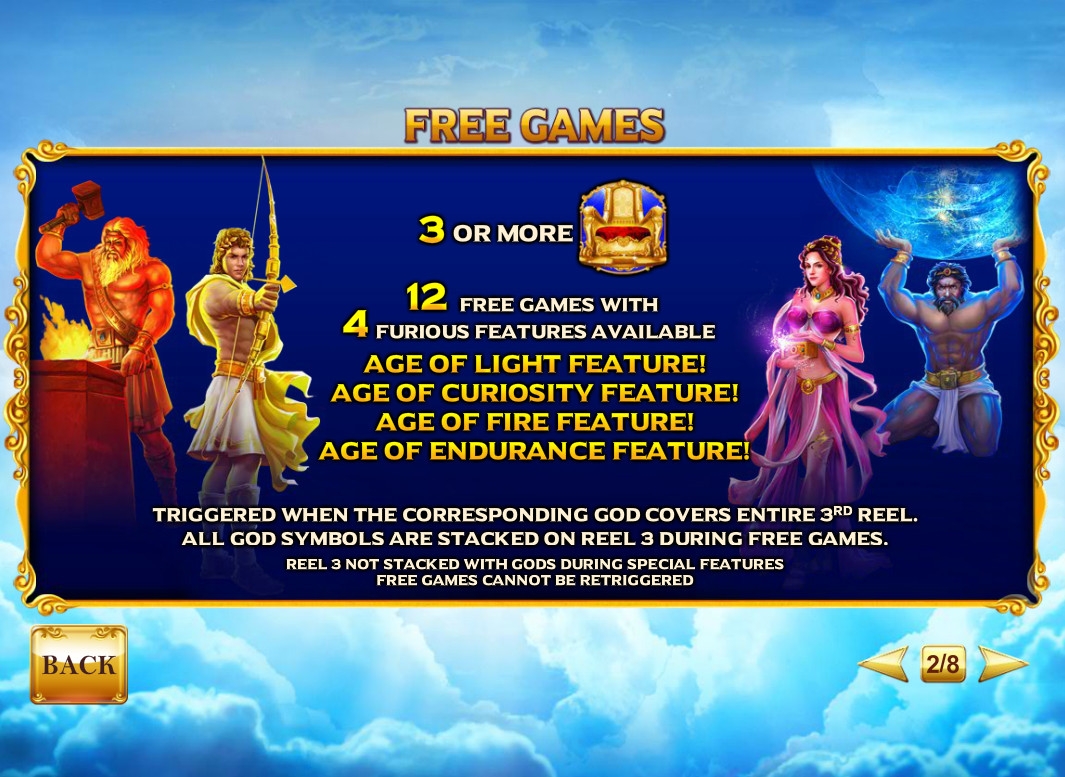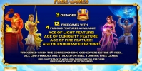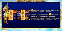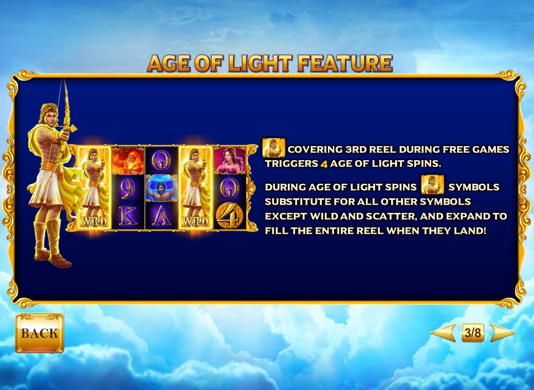 - Age of Light – Начинаются четыре спина, во время которых Аполлон играет роль дополнительного Wild, расширяющегося на всю колонку.
