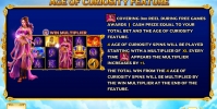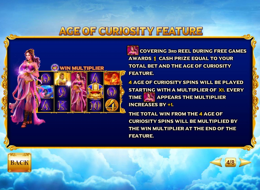 - Age of Curiosity – Игрок сначала получает выплату от Пандоры, равную одной суммарной ставке. Затем начинаются четыре вращения с увеличивающимися дополнительными множителями, которые учитываются при определении размера выплаты.