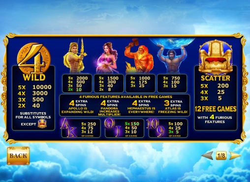 Размер выплаты определяется умножением ставки по линии на коэффициент последовательности, указанный в таблице. Он бывает от х5 до х10000. Если комбинаций больше одной, начисленные кредиты суммируются. Игры на удвоение в Age of the Gods: Furious 4 нет.