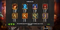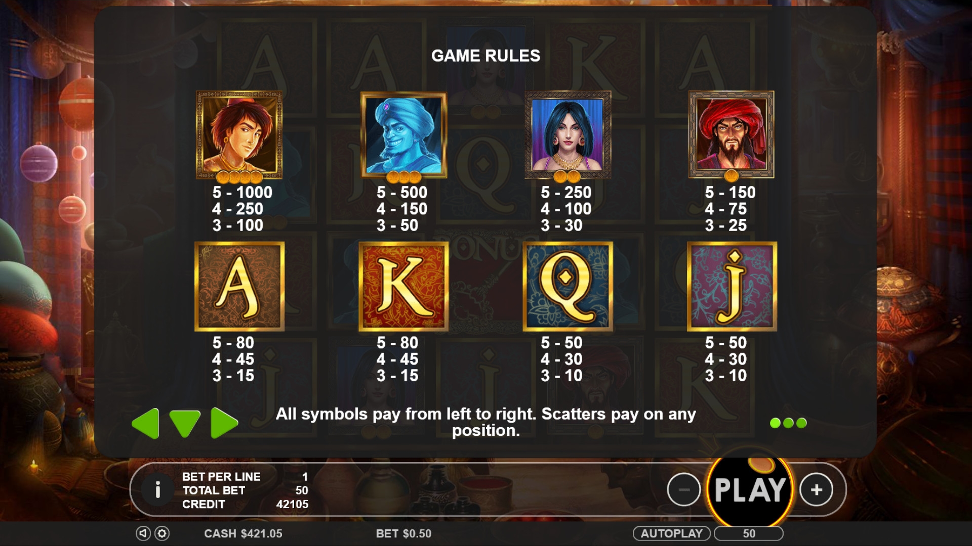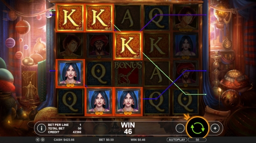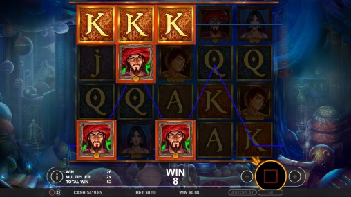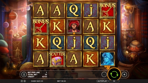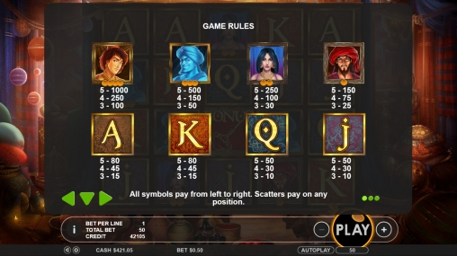 Открыв игровой автомат, вы увидите Аладдина, его возлюбленную Жасмин, Джинна и разбойника. Кроме того, на экране появляются выдержанные в восточном стиле номиналы карт от валета до туза.