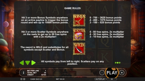 - Bonus (меч) запускает призовую игру тремя и более такими символами на активной линии.