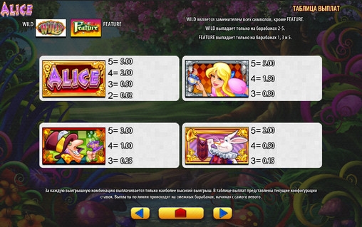 - Alice Feature – Может начаться в любом спине. Один из пяти барабанов станет полностью «диким».