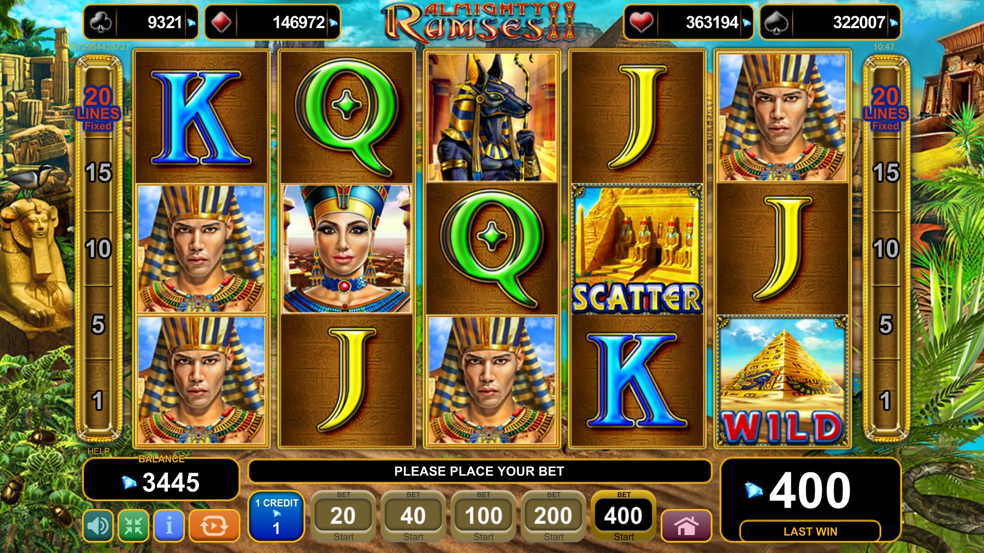 В Almighty Ramses II предлагаются девять обычных картинок, скаттеры, джокеры, риск-игра по равным шансам и фри-спины с бонусами.