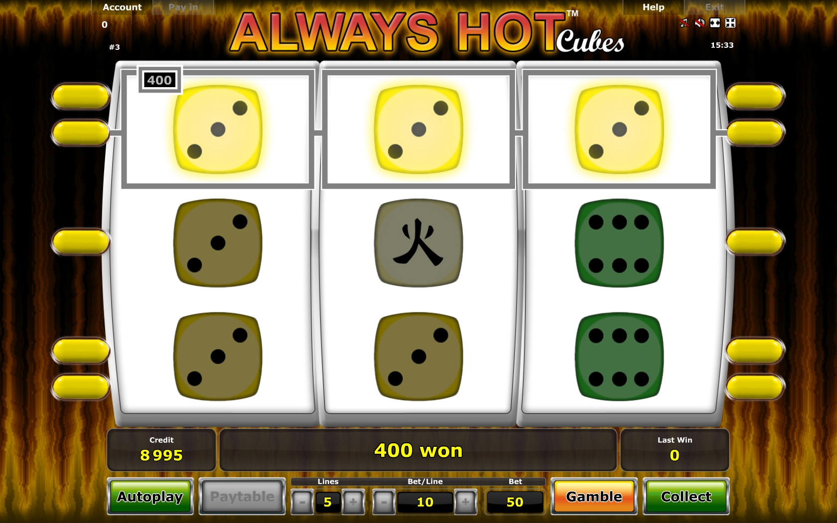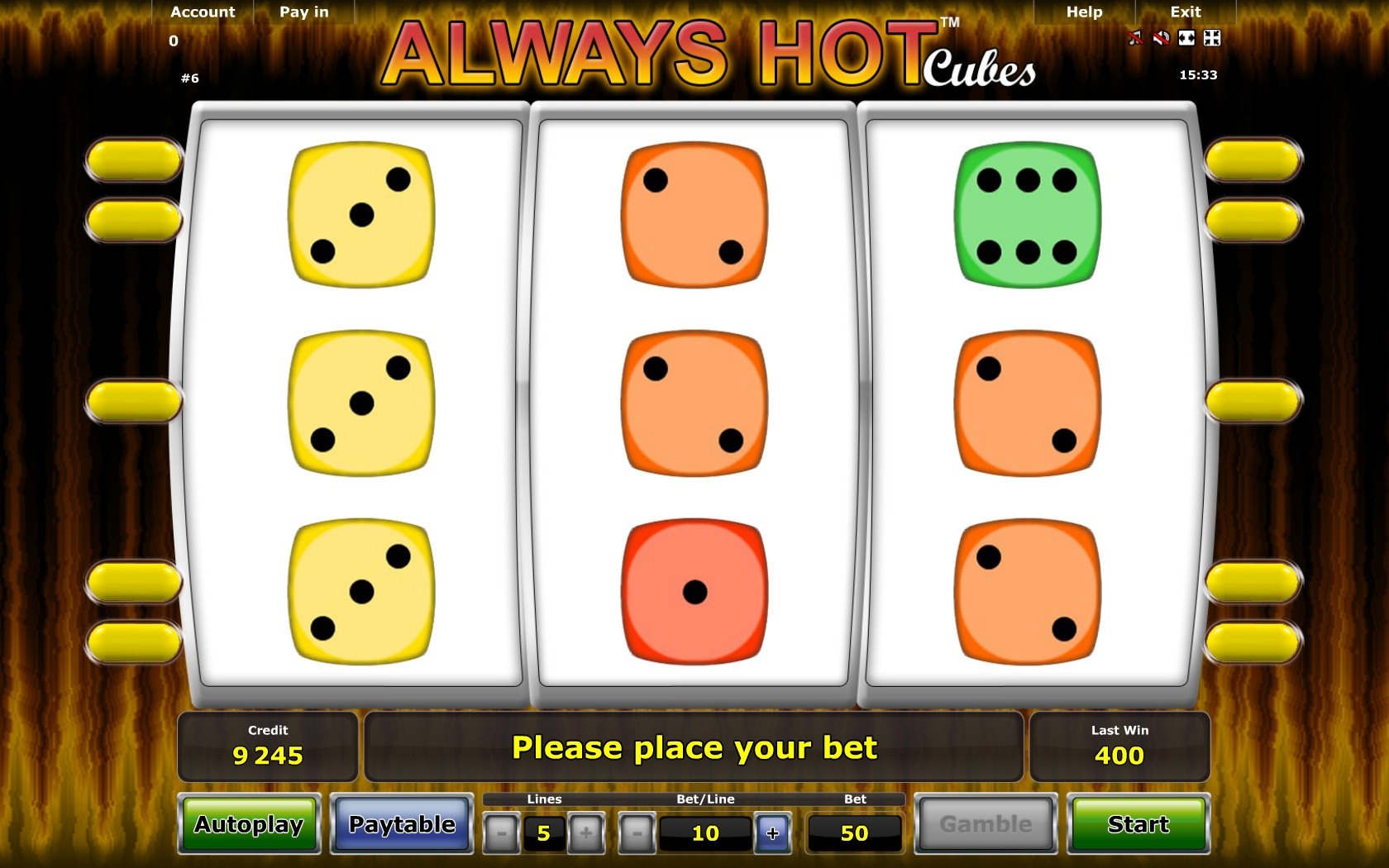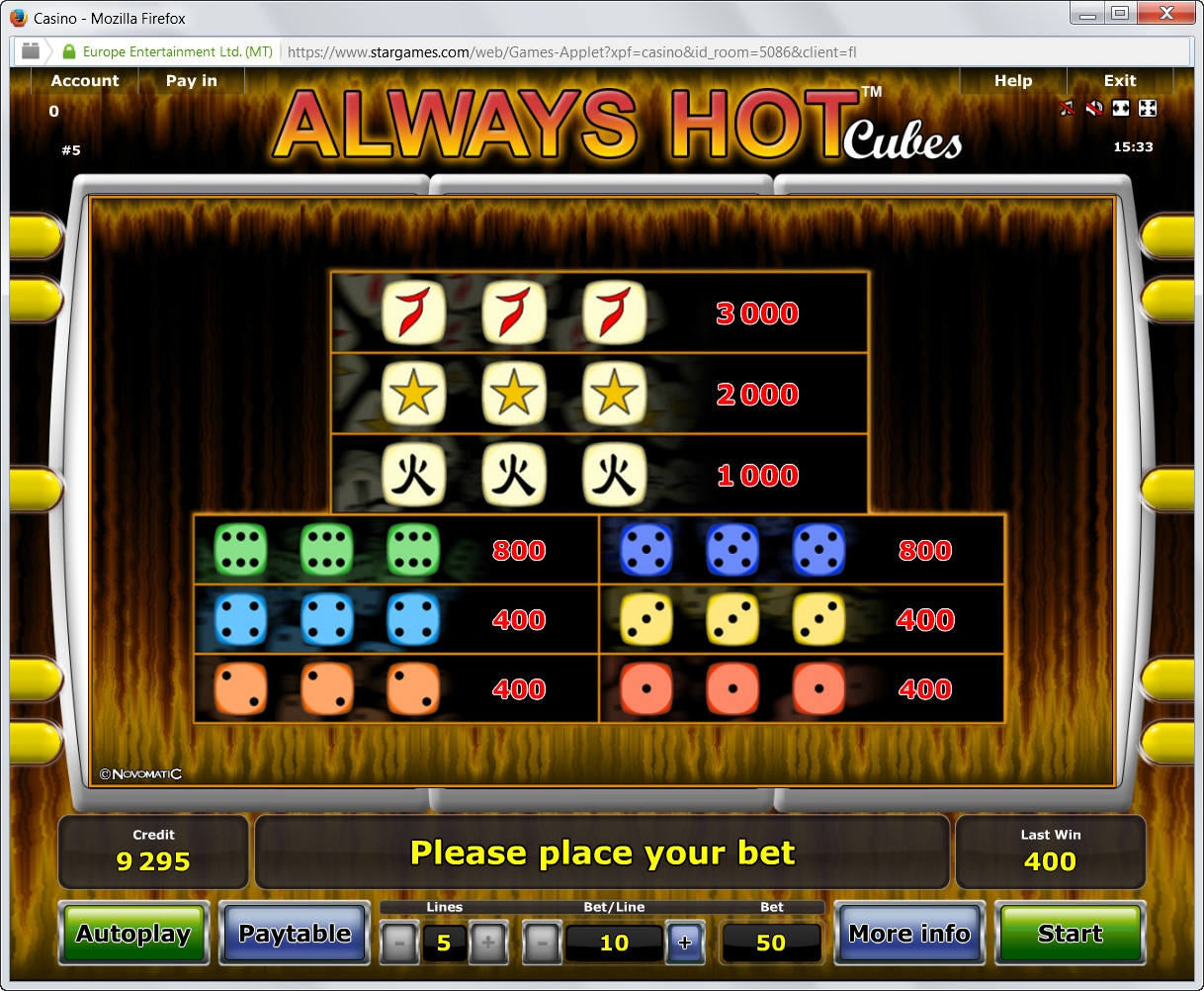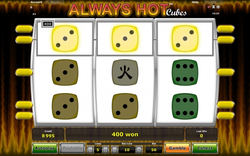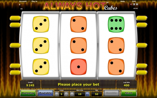 В Always Hot Cubes три барабана, пять постоянно активных линий для образования на них комбинаций и девять символов на экране (3х3). По всем пяти позициям ставки всегда равны. Диапазон простирается от десяти кредитов до двух тысяч. Несложно подсчитать, что на раунд можно ставить не менее ста и не более десяти тысяч кредитов.
