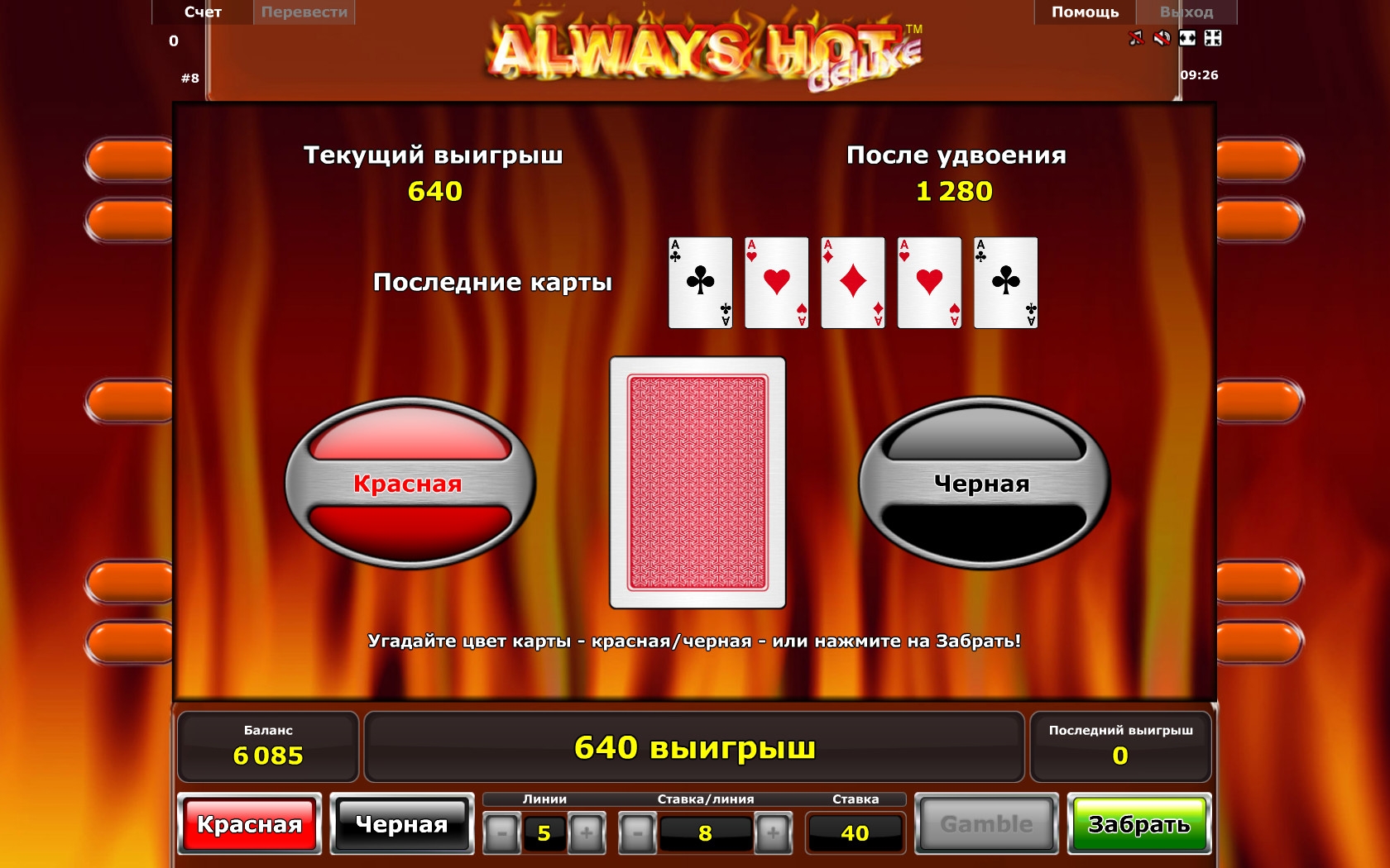 Все деньги, начисленные за раунд, можно сразу забрать на счет. Также разрешается принимать участие в игре на удвоение. Она реализована в наиболее распространенном виде. Вы увидите закрытую карту и должны будете угадать ее цвет. Если вам повезет, выплата удвоится. Если вы сделаете неправильный выбор, вся сумма, стоящая на кону, достанется заведению. Подряд можно играть несколько раз подряд, однако для каждой ставки есть определенный лимит, по достижению которого раунд завершится.