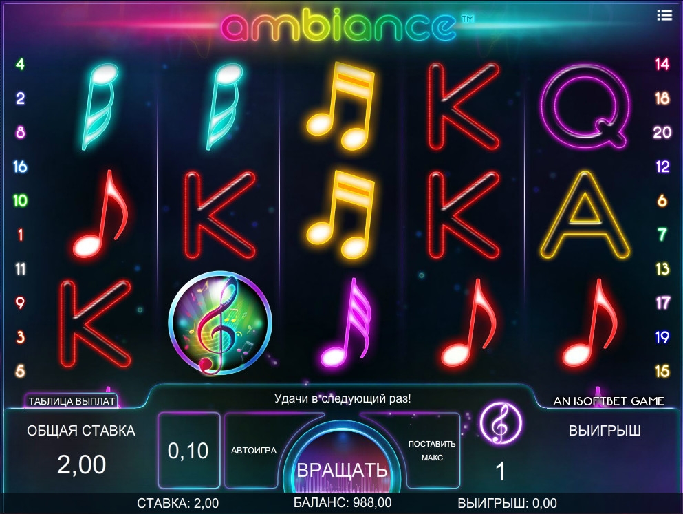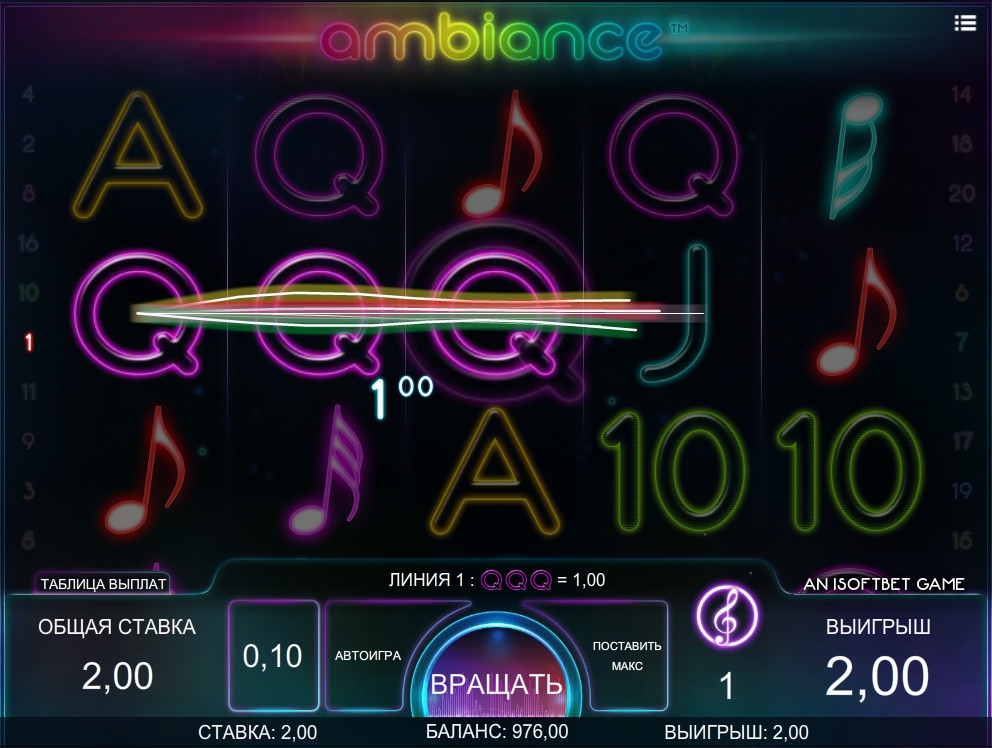 Представленный компанией iSoftBet бесплатный игровой автомат Ambiance погрузит вас в волшебный мир очаровательной и спокойной электронной музыки. Он в дребезги разбивает популярное заблуждение, что азартные игры должны проходить в стиле казино Лас-Вегаса, где днем и ночью грохочут оркестры, кричат подвыпившие посетители, ярко мелькает реклама, и звенят слот-машины, производящие крупные выплаты. Нет, в данной модели все будет совершенно иначе. Вы будете играть, наслаждаясь удивительно красивыми мелодиями. При этом вы сможете надеяться на весьма солидные выигрыши. Но пора переходить от вступления к основной части обзора, подготовленного порталом Casinoz.