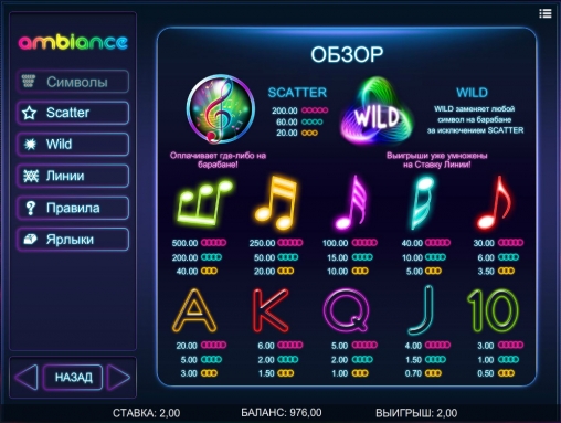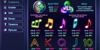 На барабанах видео-слота «Эмбиент» нарисованы разноцветные, светящиеся ноты и яркие номиналы игральных карт от десятки до туза. В роли особых элементов выступают символы Wild (соответствующая надпись) и Scatter (скрипичный ключ). Разберемся с их возможностями: