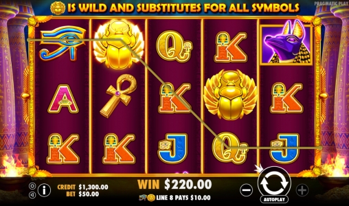 Царица Клеопатра, священные знаки египтян, стилизованные номиналы игральных карт и черный пес – эти картинки составляют комбинации на линиях, выстраиваясь слева направо.