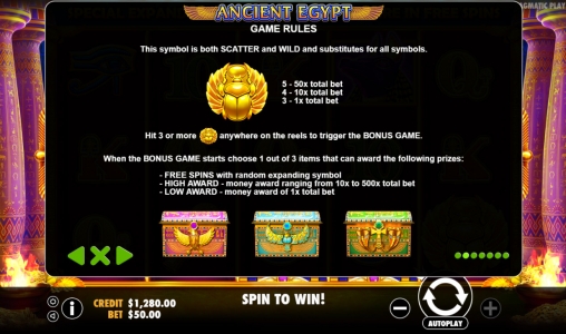 Три, четыре или пять скаттеров, оказавшихся где-нибудь в колонках, открывают дополнительный экран. Вы окажетесь в гробнице фараона, где стоят три сундука. Выбрав один из них, вы узнаете, какой приз вам полагается.