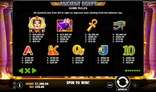 Играть на слоте Ancient Egypt можно лишь по десяти активным полосам. На каждую разрешается ставить до десяти чипов стоимостью от одного до пятидесяти центов (0.10 – 50 долларов на спин).