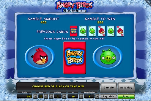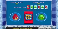 Суммарный выигрыш за спин можно попытаться увеличить в риск-игре по шансам видео-слота Angry Birds - Christmas. Здесь нужно угадать, какого цвета закрытая карта. Если вам это удастся, выплата удвоится. Если нет, вы проиграете ставку. В одном раунде можно играть несколько раз подряд (при условии, что все попытки будут удачными).