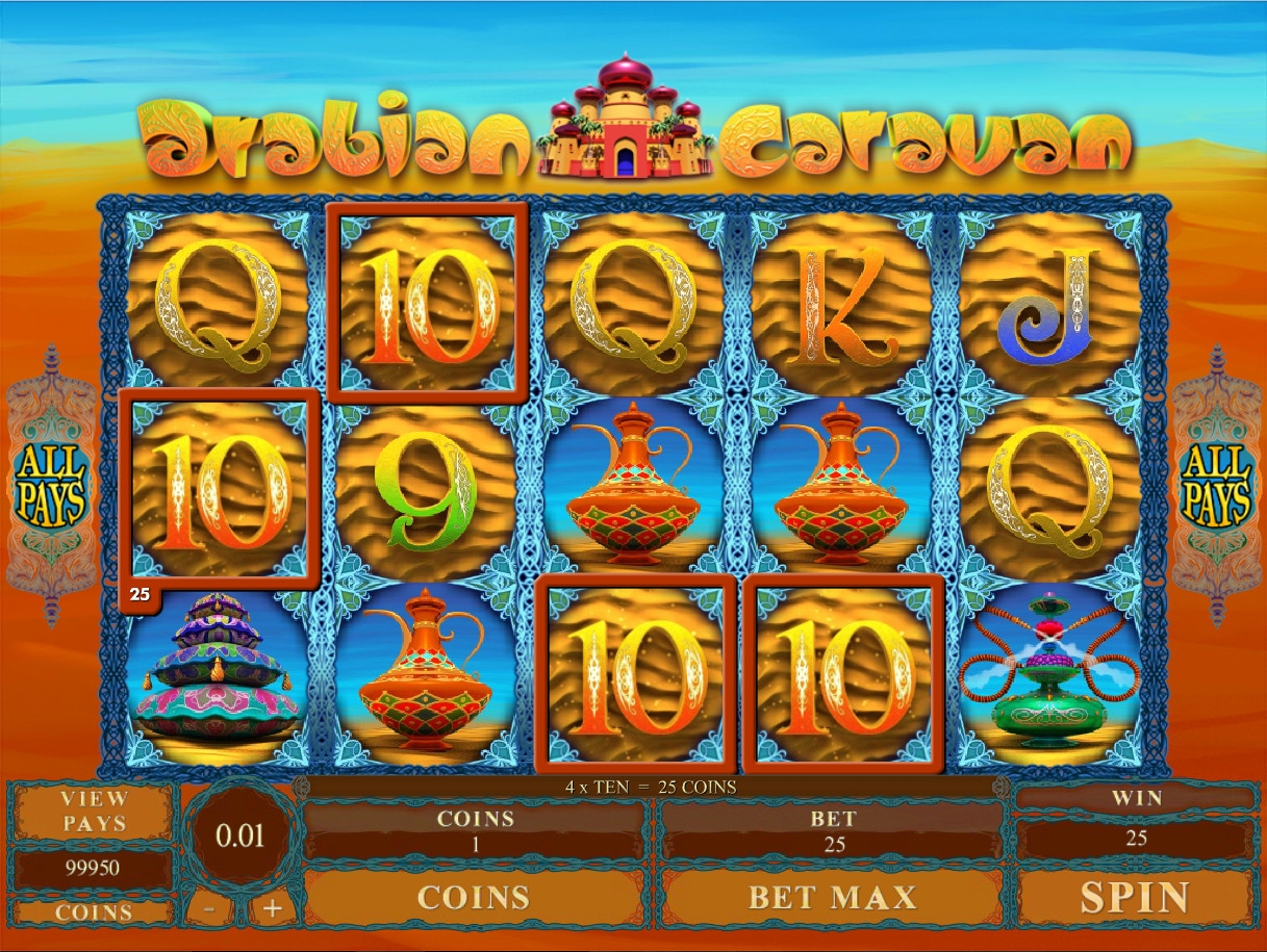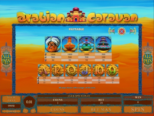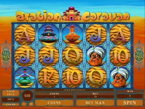 Arabian Caravan имеет пять барабанов. На каждом из них после остановки видны по три картинки, что дает пятнадцать символов на экране в целом. Играть на игровом автомате клиенты могут по ставке, кратной двадцати пяти. При этом каждая из этих позиций может варьироваться от одной до двадцати монет номиналом от цента до двадцати. Соответственно, максимальная ставка на раунд достигает ста долларов.