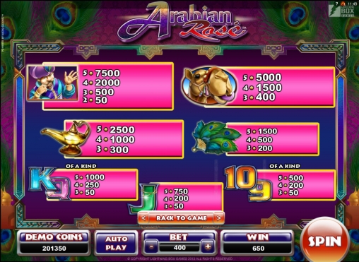 В видео-слоте Arabian Rose есть, помимо таблицы выплат, подробный раздел с правилами. Также здесь доступны разнообразные пользовательские настройки, статистика и прочие опции, делающие игровой процесс более комфортным.