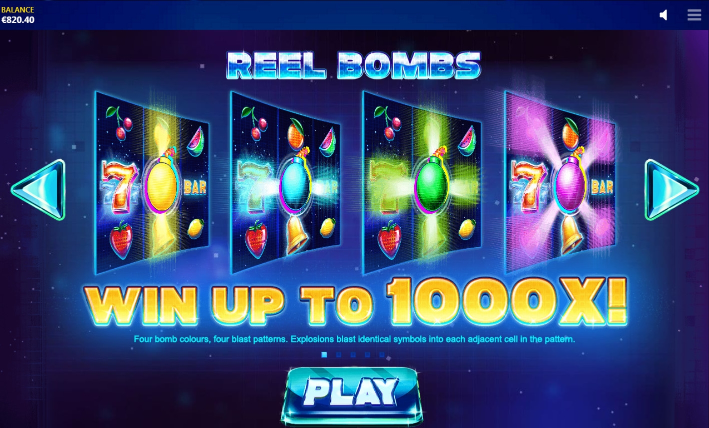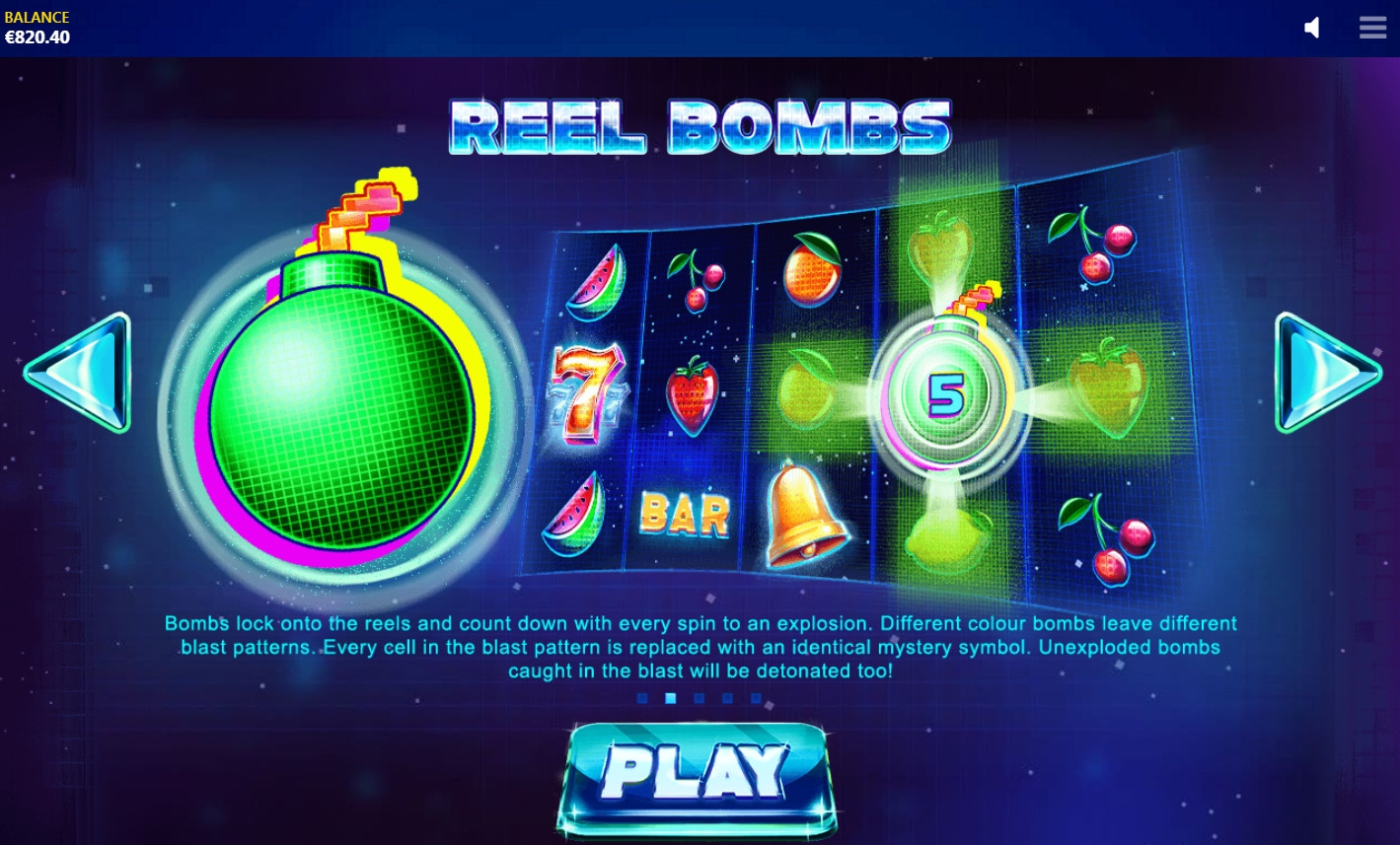 - Locked Reel Bombs – В разных ячейках выпадают бомбы. На каждой из них есть отдельный счетчик, уменьшающийся на единицу с каждым спином. Бомба занимает одну позицию до нуля, а затем взрывается. Они бывают четырех видов, различающихся цветами. Каждая из них заполняет одинаковыми картинками несколько соседних ячеек, придерживаясь определенного шаблона: только по горизонтали, только по вертикали, в обоих направлениях вверх и вниз, а также в обе стороны по диагонали. Символы, которые здесь появляются, выбираются случайным образом. Далее происходит начисление выплат по комбинациям.