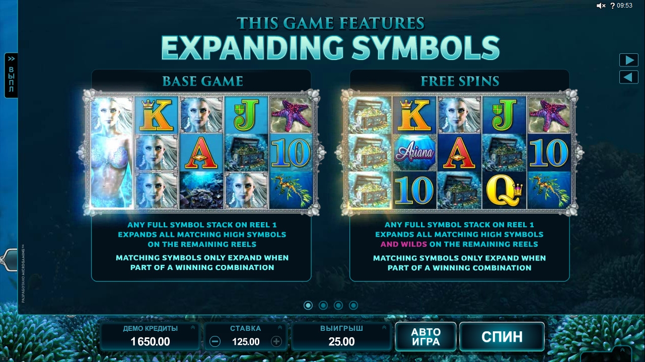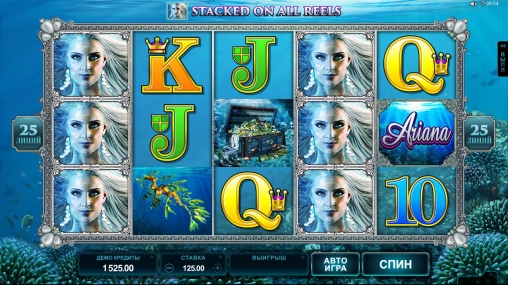 При этом Ариана идет стеками во всех колонках, а водоросли, пейзаж или сундук могут занимать весь первый барабан. Если первая колонка занята каким-то из подобных символов, он разворачивает на три позиции по вертикали остальные такие же картинки на экране. Таким образом, порой на всех пятнадцати позициях изображены одинаковые элементы.
