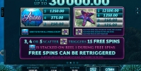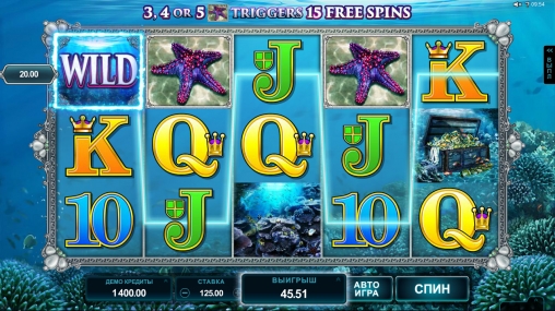 - Scatter формирует комбинации независимо от расположения. От двух подобных символов, выпавших в любой позиции, дают выплату, которая рассчитывается по общей ставке на раунд (от одной до ста). Три и более скаттеров также начинают пятнадцать фри-спинов, в течение которые деньги за клиента ставит заведение. Здесь Wild появляется стекированным на первом барабане и разворачивает все «дикие» символы, пейзажи, сундуки и водоросли.