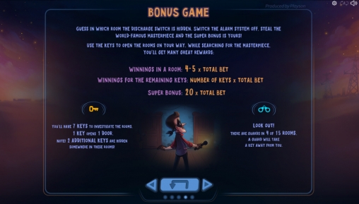 - Bonus Game – Здесь вору нужно будет отключить сигнализацию и украсть дорогую картину. В его распоряжении будут ключи, которые нужно использовать для отпирания дверей. Вы будете указывать, в какую сторону ему двигаться. Чем дальше грабитель заберется, тем крупнее будет итоговая выплата.