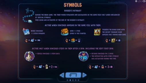 - Robber’s Pathway («Путь грабителя») – По картинкам на основном экране проходит условная тропка, по которой должен проследовать главный герой в ходе игрового процесса. Начинается она в верхнем левом углу, а завершается в нижнем правом. Грабитель начинает движение, когда в ячейке перед ним оказывается телефон. Количество ходов определяется случайным образом. Персонажа могут поджидать разные неожиданности. Охранник задерживает вора на несколько спинов, шкатулка добавляет количество будущих спинов, картина запускает бонусный раунд, а привидение отгоняет афериста на пару шагов назад.