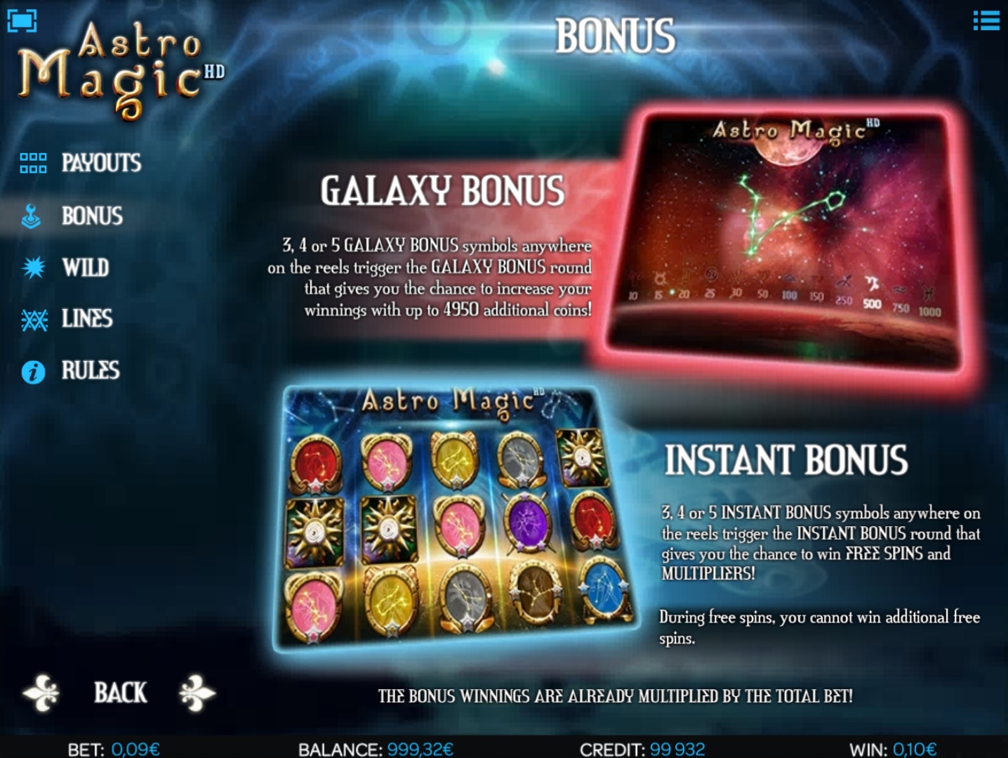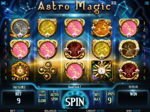 «Астромагия» - азартный игровой автомат для бесплатного тестирования и реальной игры на деньги. В нем пять барабанов и девять активных линий, на которых формируются оплачиваемые цепочки. Пользователь может задействовать любое количество доступных полос.