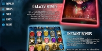 - Galaxy Bonus запускает еще один призовой раунд, когда от трех символов оказываются на экране.