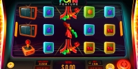Старый телевизор, игровая приставка Atari, джойстик, фрукты, ягоды и колокольчик – эти картинки составляют комбинации по описанным выше правилам. Одинаковые иконки могут выпадать цепочками в колонках, порой занимая целые столбцы.