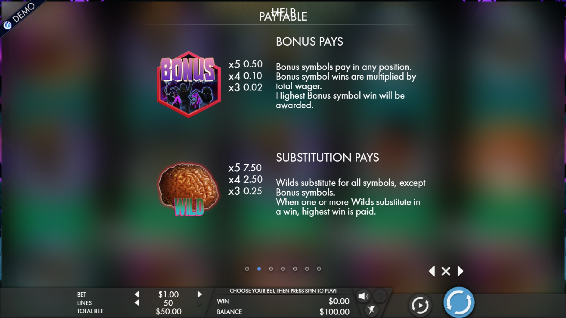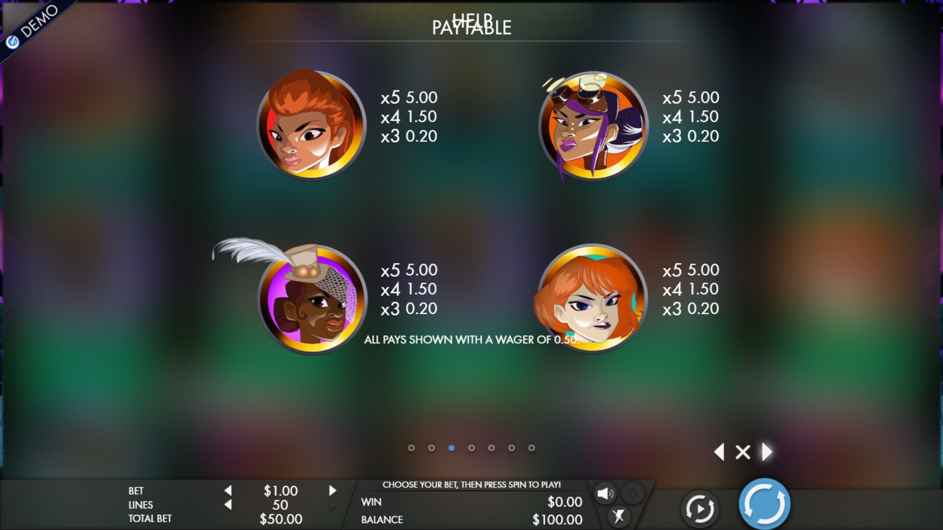 Пользователи могут задействовать от одной до пятидесяти активных полос, на которых формируются комбинации. Ставки по линиям могут быть от 0.01 до десяти долларов. Выходит, что на раунд принимается даже всего один цент, а максимум достигает пятисот долларов.