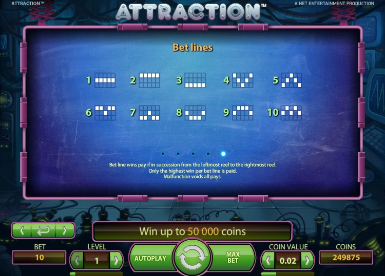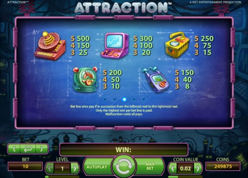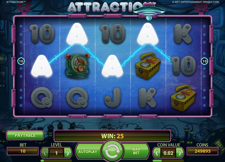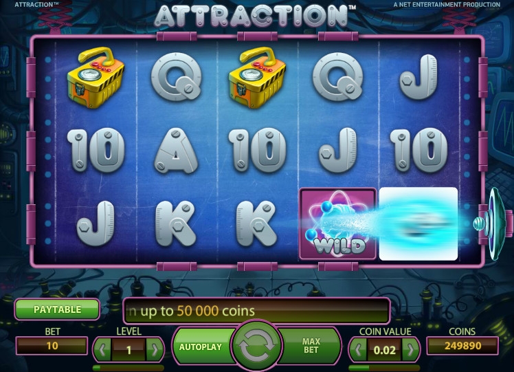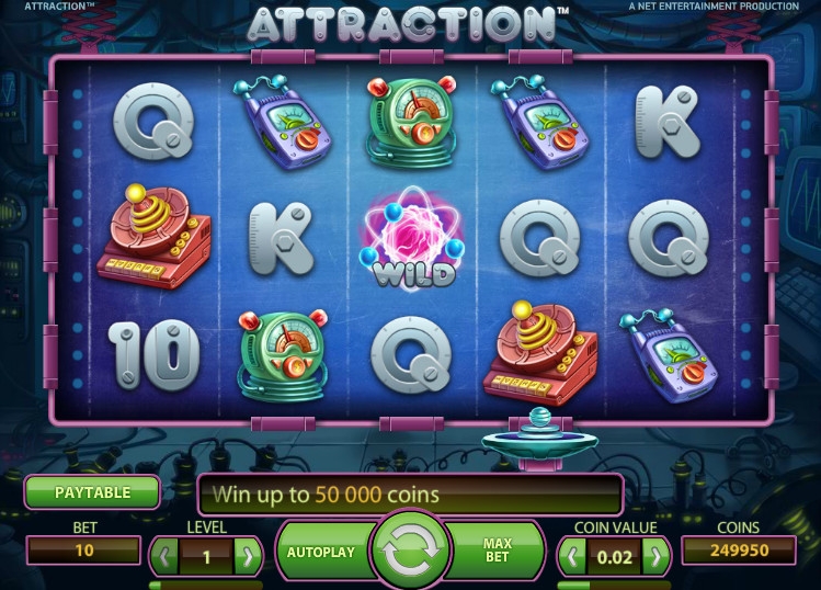 Компания Net Entertainment представила на суд публики оригинальный видео-слот Attraction, в котором она реализовала несколько любопытных функций. Действие игры разворачивается в какой-то физической лаборатории, где испытывается некое устройство. Как именно данный прибор используется непосредственно в геймплее, вы узнаете из нашего обзора. Советуем не оставлять этот бесплатный игровой автомат без внимания, потому что он действительно интересный и красочный.