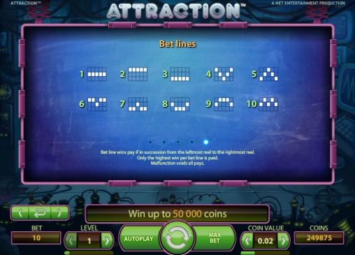 Attraction – 5-барабанный слот с картинками на экране в три ряда. Играть на игровом автомате разрешается по любому количеству активных линий от одной до десяти. Ставка на каждую из них может достигать десяти монет номиналом от одного цента до одного евро. Следовательно, на раунд принимается не более ста евро.