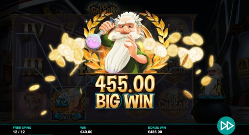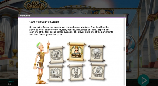 - Ave Caesar – Цезарь требует выплатить какую-то сумму игроку. Затем он предлагает выбрать одну из шести грамот, чтобы определить тип вознаграждения. Это может быть денежная выплата, фри-спины или один из призовых розыгрышей, описанных ниже в обзоре видео-слота.