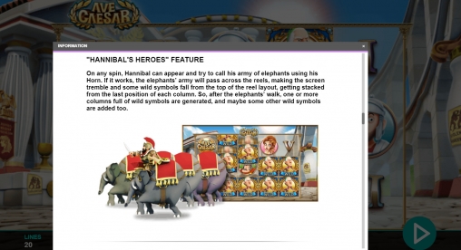 - Hannibal’s Heroes – Появляется Ганнибал с армией боевых слонов, которые пробегают по экрану и сотрясают картинки. В колонки падают джокеры, остающиеся в нижних ячейках. Затем начисляются выплаты по сложившимся комбинациям.