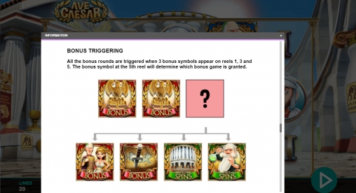 - Bonus (штандарт римских легионеров) появляется в первой, третьей и пятой колонках. Три бонусных картинки запускают бонус. Его тип определяется символом в последнем столбце.