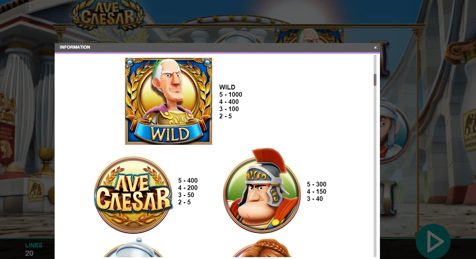 В игровом автомате «Аве, Цезарь» пять барабанов и двадцать фиксированных полос, на которых составляются оплачиваемые комбинации. На экране одновременно появляются пятнадцать картинок, выстраивающихся в три ряда.