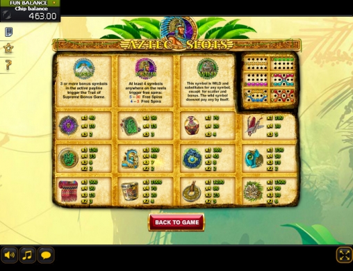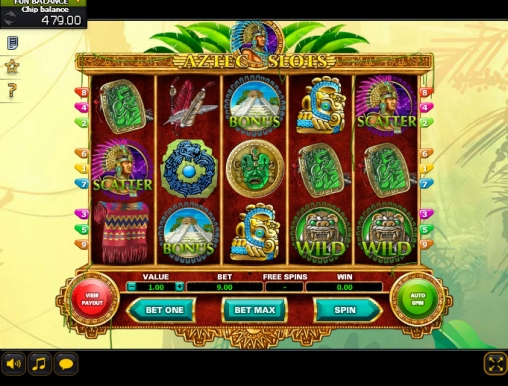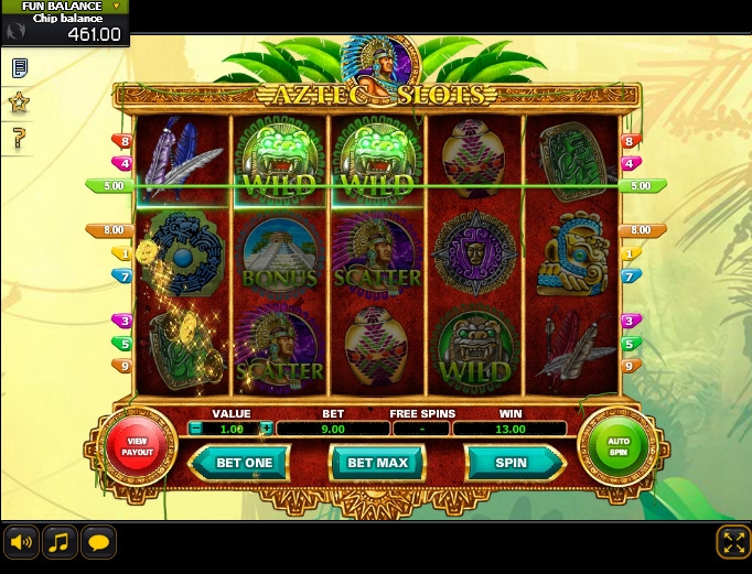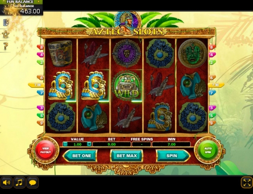 В новом варианте «Слотов ацтеков» пять барабанов, девять линий и три ряда картинок на экране. Играть на игровом автомате можно по любому количеству активных линий из предлагаемых. Ставка на каждую варьируется от пятидесяти центов до семи евро. Так что на спин можно поставить до шестидесяти трех евро.