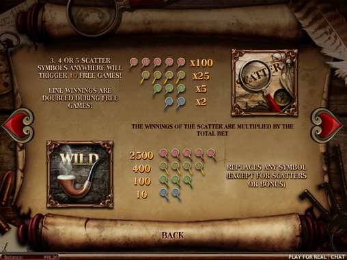 Специальными символами являются Wild (курительная трубка), Scatter (лупа) и Bonus (различные предметы, которые считаются уликами).