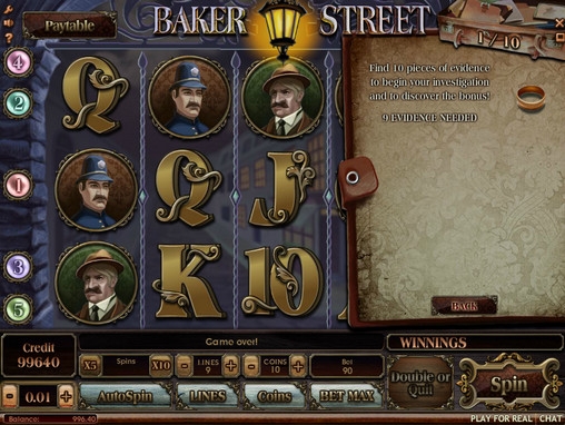 Привлекает в этой онлайн-игре Бейкер-стрит - Baker Street начальный бонусный денежный приз. Автомат игровой с детективным дизайном, попав на Шерлок Холмса табачную трубку Вас ожидает привлекательный выиграш, а при выпадении пяти одиннаковых символов - ошеломительный приз. Делая ставки на большое количество линий азарт выиграша не заставит ждать. Начинайте с начального бонуса и выиграшные ставки удивят Вас.