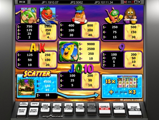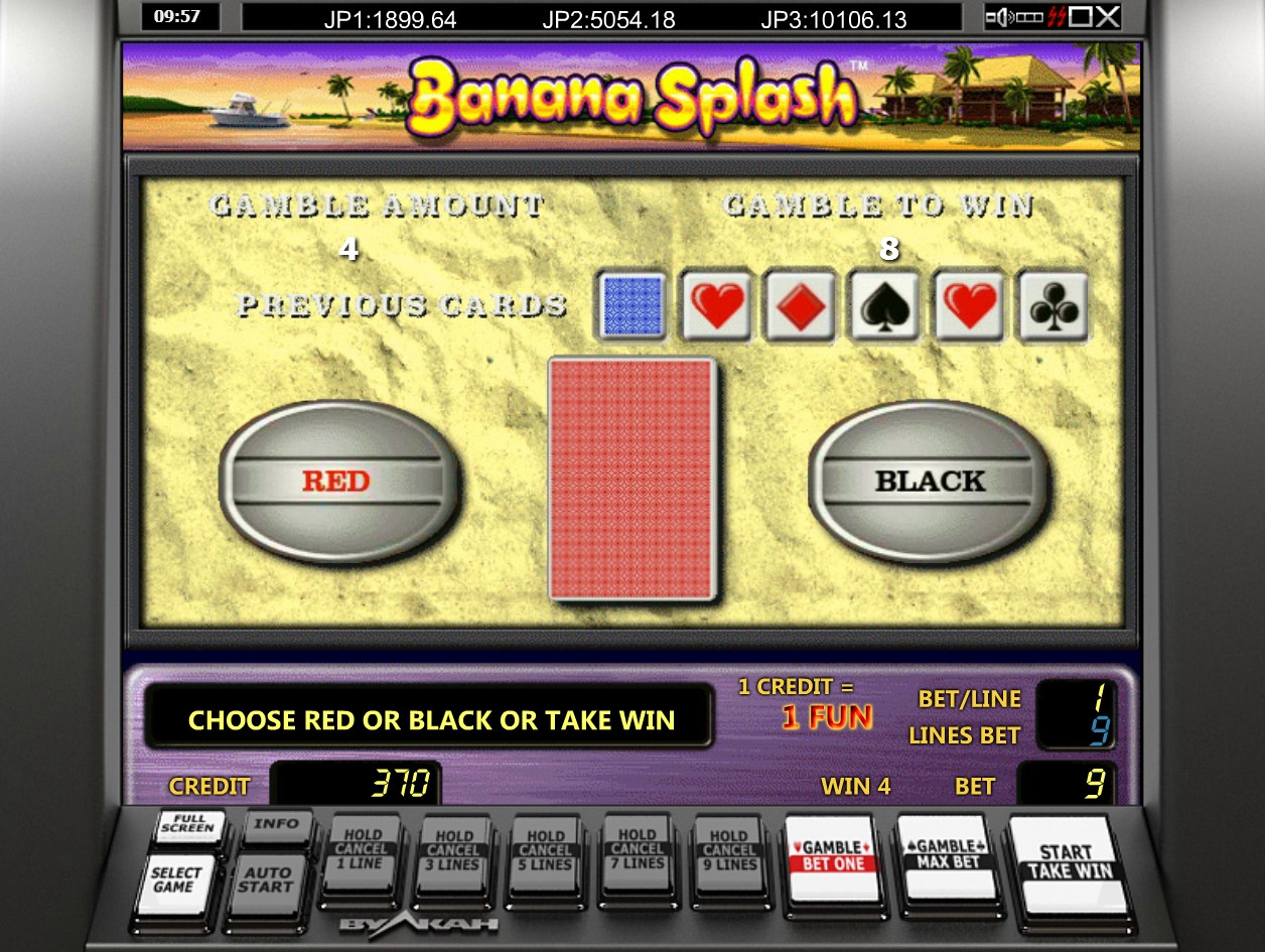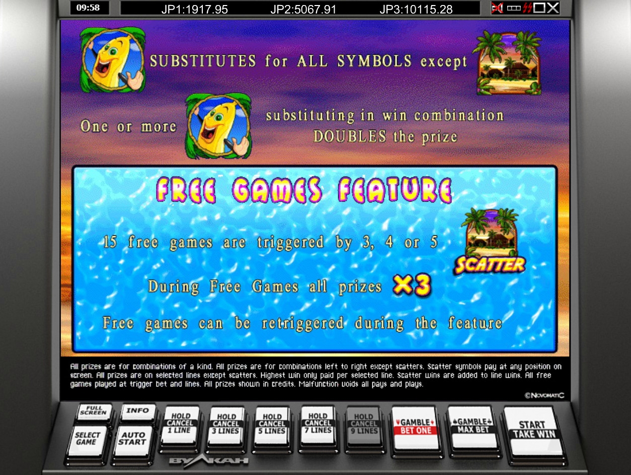 «Банановый всплеск» является 5-барабанным игровым автоматом с пятнадцатью картинками на основном экране. Вы сможете делать ставки по одной, трем, пяти, семи или девяти активным полосам. При этом на них принимаются лишь равные суммы. Диапазон следует уточнять в казино, где вы будете играть.