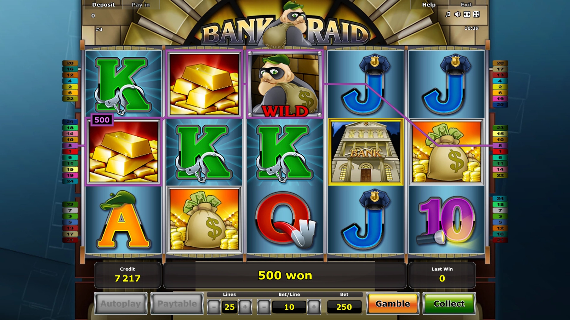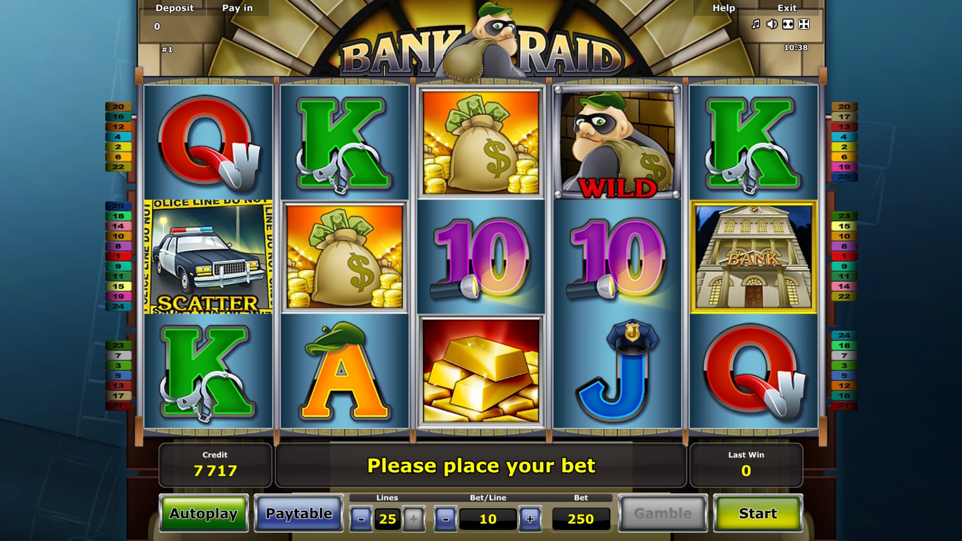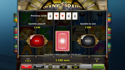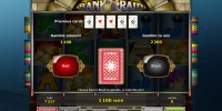 В Bank Raid есть несколько обычных картинок, два особых символы, риск-игра на удвоение и бесплатные вращения.
